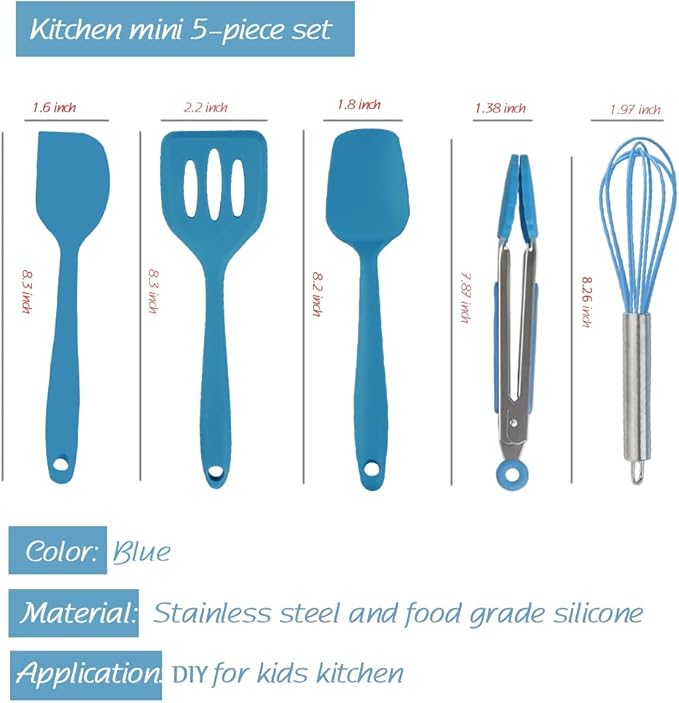 Mini Spatula And Mini Kitchen Utensil Set Small Five-Piece Set Tiny Silicone Kids Kitchen Tools Whisk Spatula Tongs Spoon And Slotted Spatula For Cooking(Kids Baking Supplies) Blue