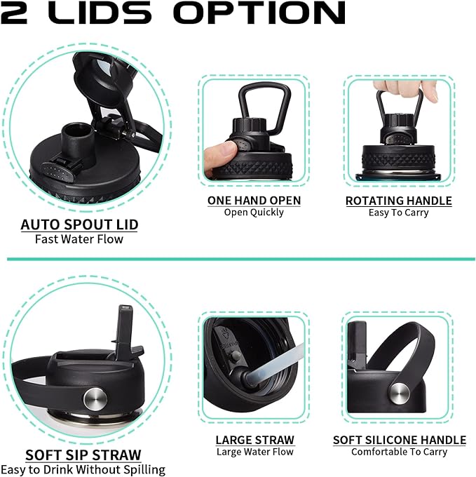 - 2 LID OPTIONS (Auto-spout & Straw): two different lids are complete LEAK PROOF & design for easy drink. The pops-up lid for easy drinking and seals shut for no leaks when you're on the go. The straw lid makes it easy to enjoy spill-proof sips, and package come with a alternative straw & a straw brush for easy cleaning