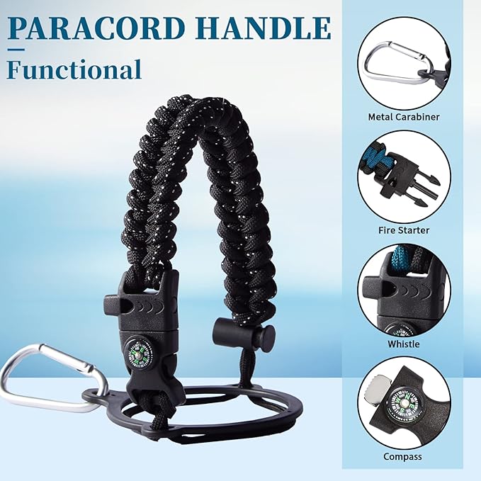 - PERSONALIZATION BOTTLE PARACORD HANDLE - 128oz Insulated water bottle with a pretty cool functional paracord handle which does more than meets the eye.?The survival strap cord is made of military-grade nylon and comes with a compass, safety loop, metal carabiner, flint, igniter, and whistle, making it a functional and stylish addition to your water flask, is perfect for outdoor camping, hiking, fitness enthusiasts