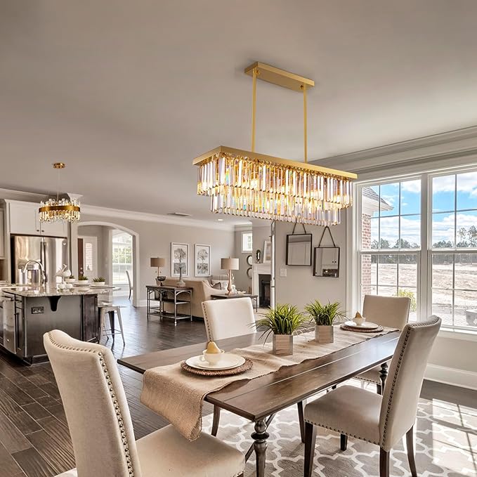 - â¨ăModern Gold Rectangular Chandelieră: Luxury gold chandelier designed with 2 tiers of clear K9 crystals adds a touch of elegance and luxurious to your space, creating a warm & welcoming atmosphere, making it more sophisticated and opulent. Suitable for dining room, living room, kitchen island, office, hallway, foyer, bathroom, etc.