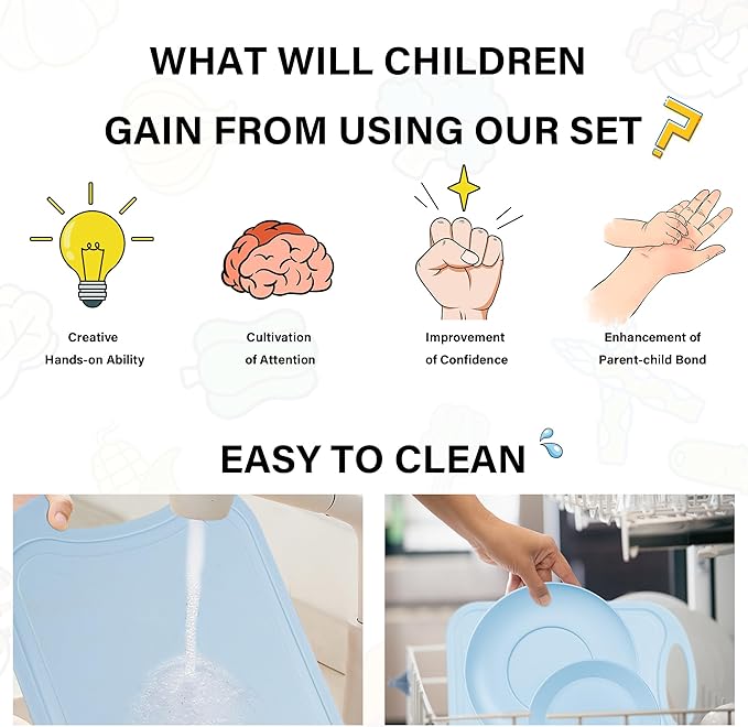 - Real Cooking Fun for Little Chefs - Our kids' knives set includes 6 pieces designed for safe and easy use by children aged 4 and up. With a vegetable cleaver, fruit knife, fork, cutting board, and 2 plates, your little one will have everything they need to get creative in the kitchen!