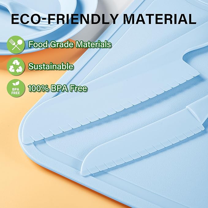 TJ POP Knives for Kids, 6 Pcs Kids Knives Set for Real Cooking, Safe Kitchen Knives Set for Children, Toddler Knife with Cutting Board & Dishes, Kids' Baking Supplies, BPA-Free (Blue)