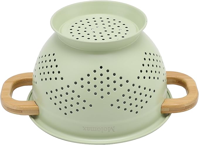 - Cool Heat-Resistant Bamboo Handles: The thoughtfully crafted bamboo handles provide a smooth and natural feel, ensuring easy maneuverability while pouring, shaking, or tossing ingredients in the colander, reducing strain on your hands and wrists.