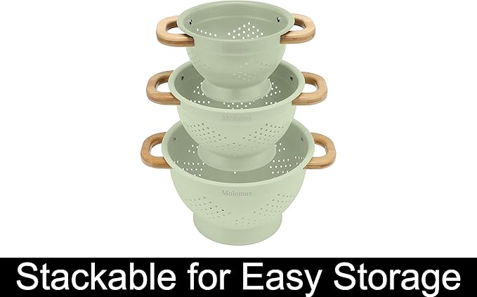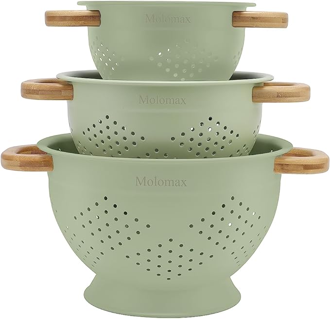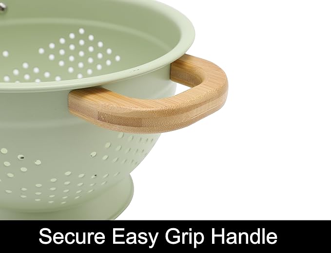 Metal Colander with Wood Handle | Set of 3 with Bamboo Handles | 1.5Q, 3Q, 5Q (Sage Leaf Green)
