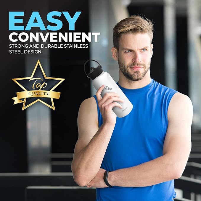 Sports Water Bottle - 32 Oz, Includes 50 Cute Flask Stickers, 3 Lids (With straw), Vacuum Insulated, 308 Stainless Steel, with a Portion of Sales Supporting Bee Conservation | White