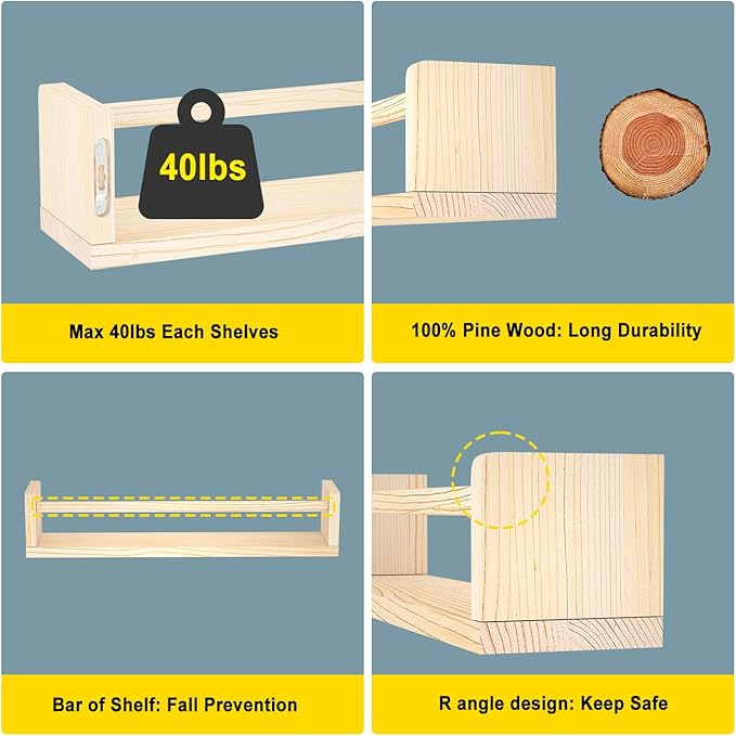 - Natural Wood Finish: Made of strong natural wood, these floating book shelves for kids room are durable and stylish, enhancing the decor of any room.
