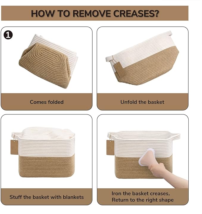 - Note. The wicker woven basket is folded for shipping. It will turn back to its elegant shape quickly by filling it with towels or blankets, and ironing is a great idea to regain the creases. Also, you can fold it into a flat shape for easy storage when not in use