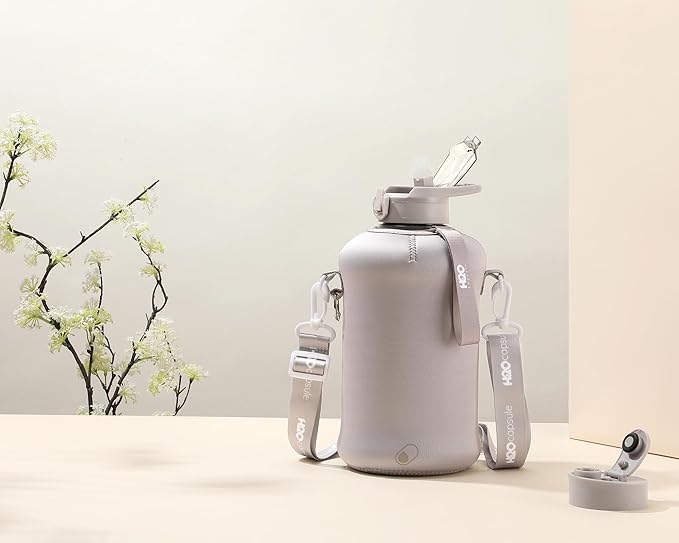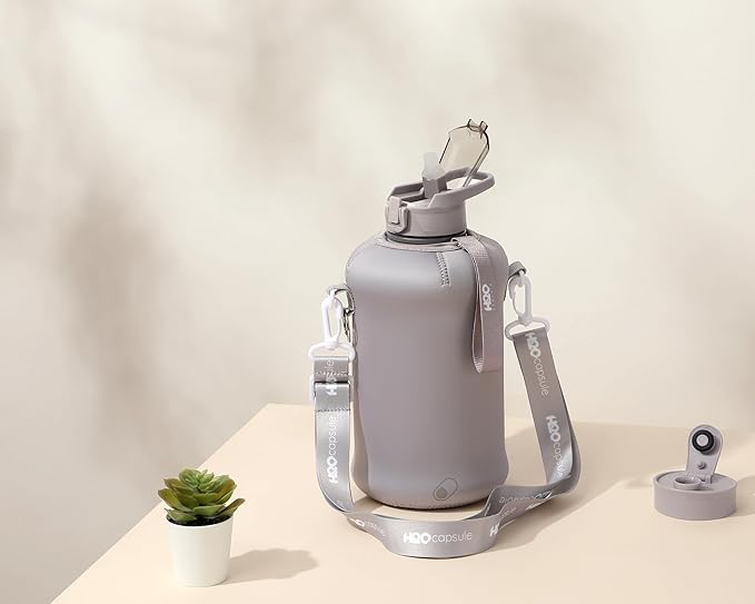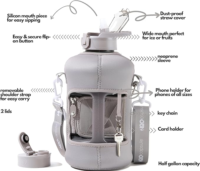 - HALF GALLON HYDRATION WITH COVERED STRAW LID: The extra large 2.2L / 74 oz plastic jug holds all the water you need to stay hydrated while you exercise. The reusable half gallon comes with a leak-proof & dust-proof covered straw lid, which helps protect the mouthpiece and flips open with a click of a button. The straw-lid is air-sealed: Run straw brush through mouth piece before initial use. The H2O Capsule bottle with storage sleeve comes with a bonus straw cleaning brush.