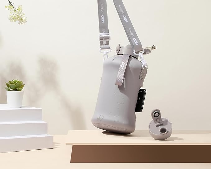 - UNIQUE STORAGE SLEEVE: Using the space under the large jug handle to store your stuff, the patent-pending removable thermal sleeve has a unique design that holds your cards and cell phone, and is finished with an in-built key chain and removable shoulder strap for convenient hands free carrying! It’s the only encased water jug that holds your things while you exercise.