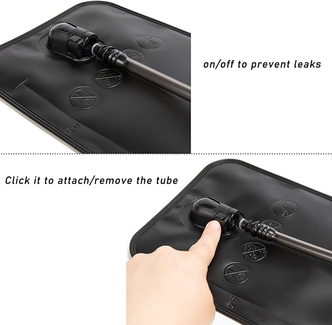 - [Easy to use]: This water bladder with bite valve can help you drink every sip of water quickly. You only need to bend the tube at a smaller angle to put the mouthpiece in your mouth. The smaller bend angle allows the water to flow more efficiently. The bite valve has a push/pull design that allows you to turn off the water flow when not in use and easily pull with your teeth to restart the flow. The cover keeps the mouth of the water reservoir clean outdoors.