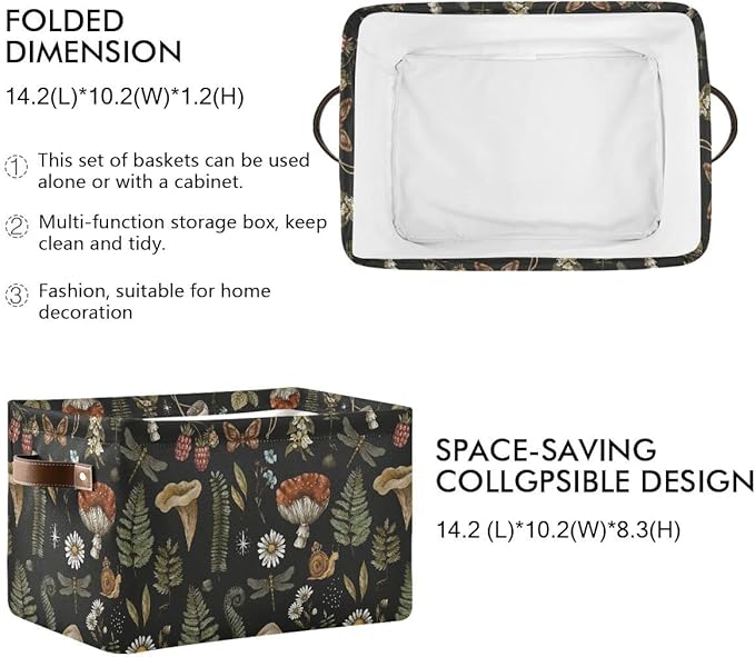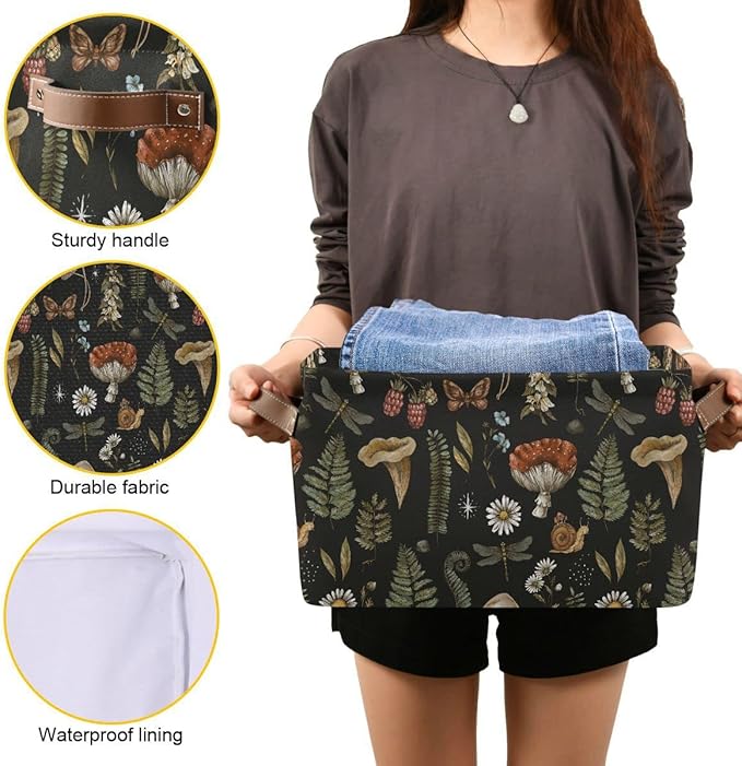 Mushroom Botanical Storage Basket Fabric Kitchen Baskets Dragonfly Berry Flowers Fern Open Home Storage Bins Boxes Foldable Organizer Bag for Baby Cloth Pet Toy Book Shelf Closet Baskets 16×12×8 IN