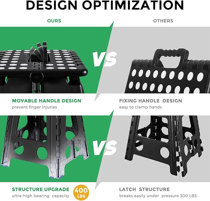 - 【Innovative Handle Design】Our 2023 collapsible stool features a flexible, movable handle design to prevent any injuries during folding or unfolding. Ascend or descend with the utmost safety and comfort with Solid Strength.