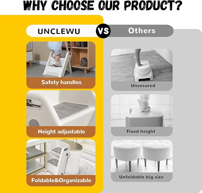 - Versatile & Essential: The UNCLE WU Foldable Step Stool, measuring 14.8L x 15.7W x 15.2H inches when unfolded, is perfect for various scenarios. It assists kids at the sink, aids in potty training, and provides an added reach in the kitchen or playroom.