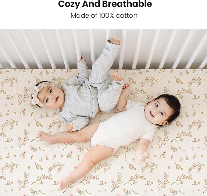 Konssy Muslin Fitted Crib Sheets 100% Cotton Baby Crib Sheets for Standard Crib Mattress (28 X 52 Inches), Soft and Breathable for Boy, Girl (Pink Floral)