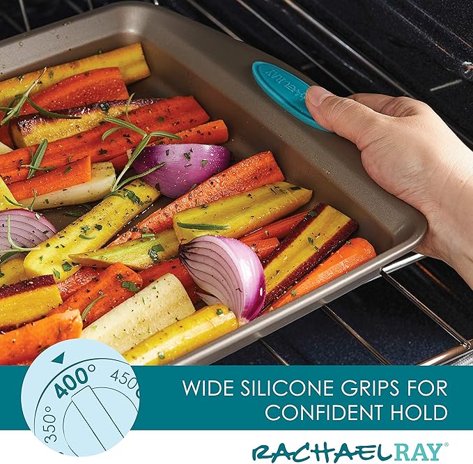 - Product 2: EVERYDAY DURABILITY: This Rachael Ray nonstick bakeware set features heavy gauge steel construction with rolled-rim bake pan edges designed for easy, everyday use