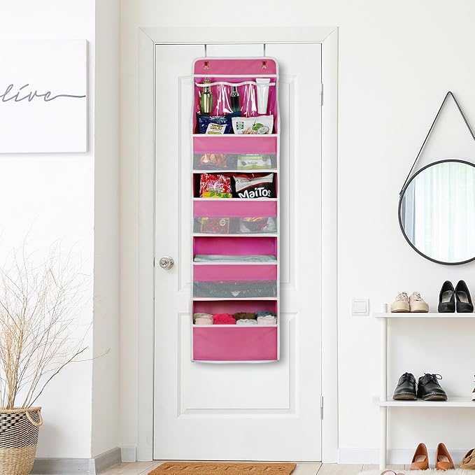 Univivi Door Hanging Organizer Nursery Over the Door Organizer Baby Storage with 4 Large Pockets and 3 Small PVC Pockets for Cosmetics, Toys and Sundries (Pink)
