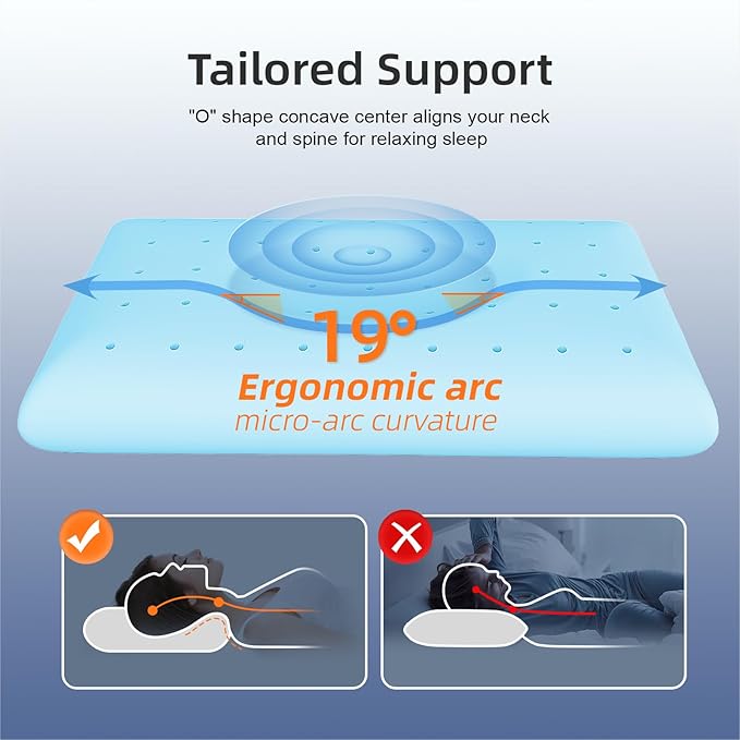 - Unique Design: The queen pillows for bed are uniquely designed with an "O" shape slightly concave center that can gently cradles your head while supporting your neck. The queen size pillows set of 2 are made with ventilated memory foam and breathable pillowcase that help dissipate heat and moisture away for your cooling night's sleep. Queen Pillows's Size is 28*16*5 inches