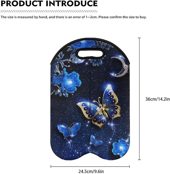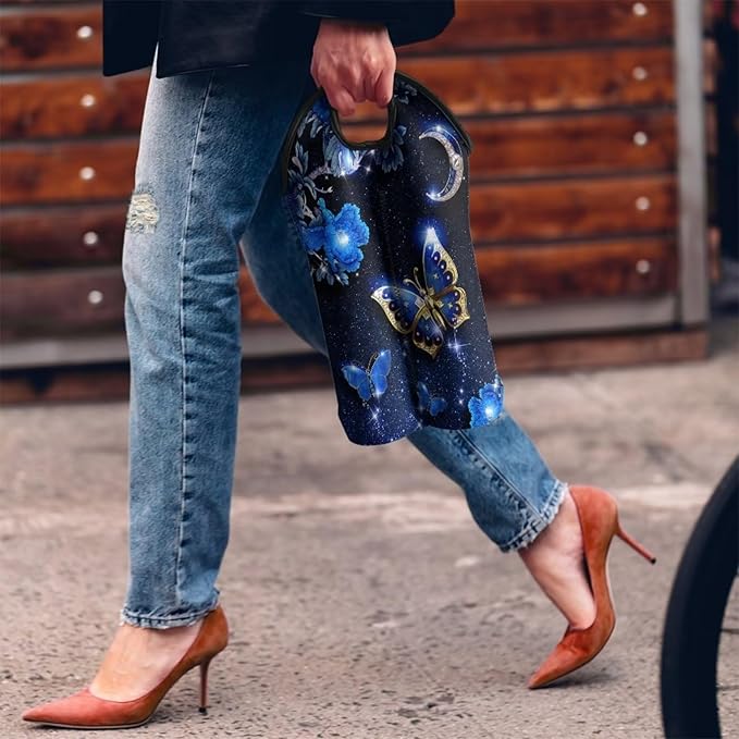 doginthehole Blue Butterfly Wine Bag with Handle Neoprene Tote Wine Champagne Beer Bags Reusable Washable Wine Carrier Portable 2 Bottle Wine Carrying Bag, Gift for Wine Lover