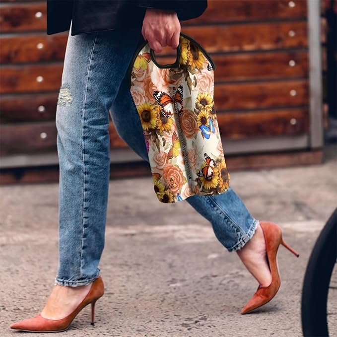 doginthehole Rose Butterfly Wine Bag Two Bottles Wine Bottle Carriers Tote Sunflower Print Wine Carrying Cooler Tote Bag Reusable Wine Bottle Protector Neoprene Protective Sleeve