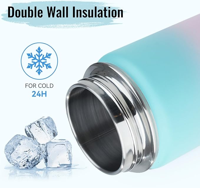 - 🥤EXCELLENT INSULATION: Our stainless steel water bottle construction made from copper coating helps the water bottle to retain the cold or heat. It can keep hot drinks for 12 hours and cold drinks for 24 hours. Safe and easy to carry anywhere.