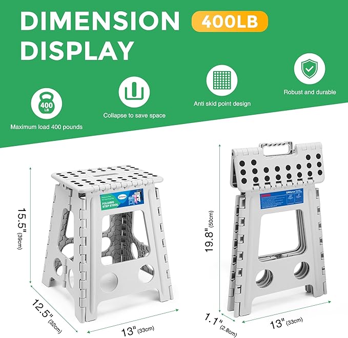 - 【High Load Capacity】Our Solid Strength folding step stool, equipped with a patented pin structure, delivers unparalleled stability. Reinforced with locking pins and sturdy hinges, the stool confidently supports up to 400lbs. Enjoy enhanced safety and stability for all your reaching needs.