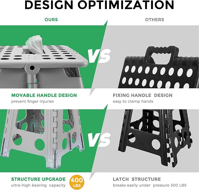 - 【Innovative Handle Design】Our 2023 collapsible stool features a flexible, movable handle design to prevent any injuries during folding or unfolding. Ascend or descend with the utmost safety and comfort with Solid Strength.