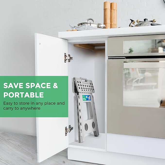 - 【Lightweight & Portable】Easy to carry around, this foldable step stool can be used across rooms or taken outdoors. Its compact design fits into any storage space, even your car for those camping trips. Upgrade your portability with Solid Strength.