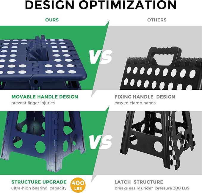 - 【Innovative Handle Design】Our 2023 collapsible stool features a flexible, movable handle design to prevent any injuries during folding or unfolding. Ascend or descend with the utmost safety and comfort with Solid Strength.