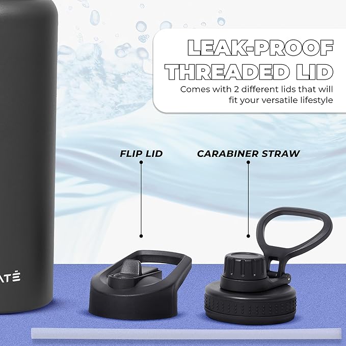 - 2 VERSATILE LIDS: Our 24oz water bottle comes with two unique lids - a straw lid for easy sipping and a chug lid for quick hydration. This water bottle thermoflask is perfect for any activity, from gym workouts to hiking adventures