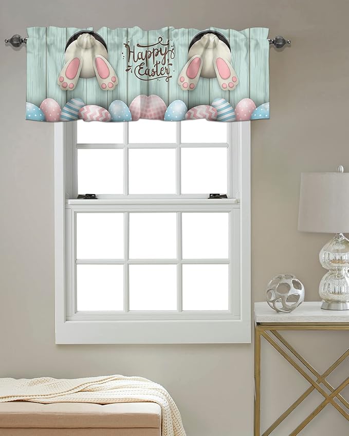 Happy Easter Valances Kitchen Curtains for Windows, Easter Bunny Tails Eggs Rabbit Spring Decor Rod Pocket Valances Blue Farmhouse Wood Short Curtains for Bedroom/Living Room,54" X 18" -1 Panel