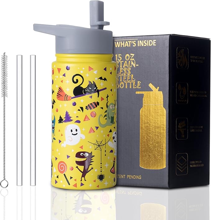 - Unleash the Halloween Spirit: Embark on a spooktacular journey with our vibrant yellow water bottle adorned with delightful Halloween motifs. From charming little ghosts, mischievous pumpkin grimaces, and monsters with scythes to witchy cats on brooms, bats, and cute skull faces – it’s a visual Halloween treat for every kiddo out there!