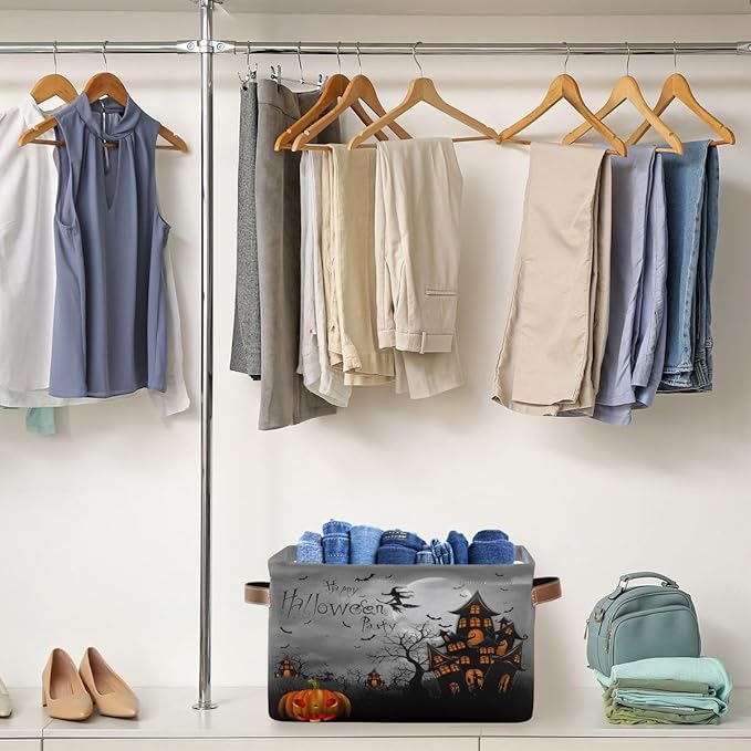 Halloween Spooky Witch Castle Storage Basket Fabric Kitchen Baskets Black Bat Ghost Pumpkin Open Home Storage Bins Boxes Foldable for Candy Toy Decorations Baskets 16×12×8 Inches