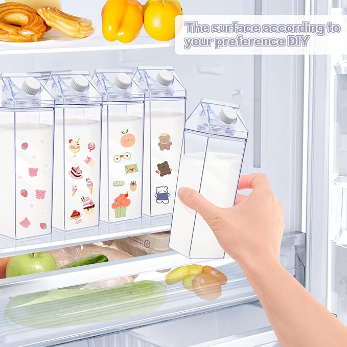 - 【Package Included】You will get 4 pieces of clear milk carton water bottles and 4pcs stickers, coming in transparent style, well matching with different colors of drinks, abundant quantity to use, replace and share with families or friends.