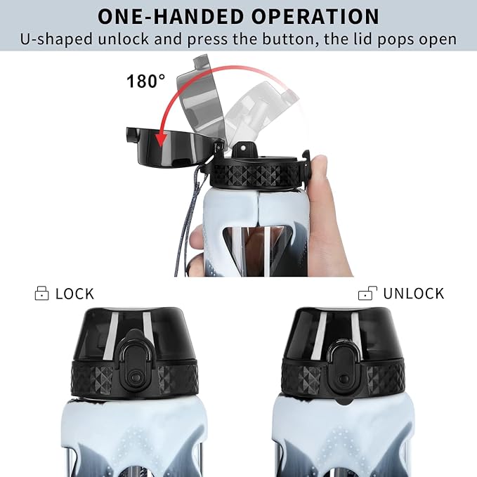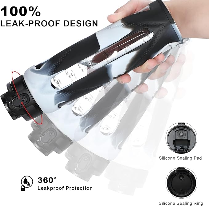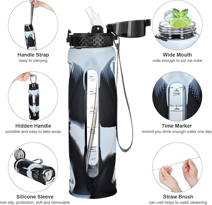 GOPPUS Glass Water Bottles with Straw and Flip Lid, Motivational Water Bottles with Time Marker Reminder and Silicone Sleeve, Leakproof, BPA Free (32 oz, Black and White)
