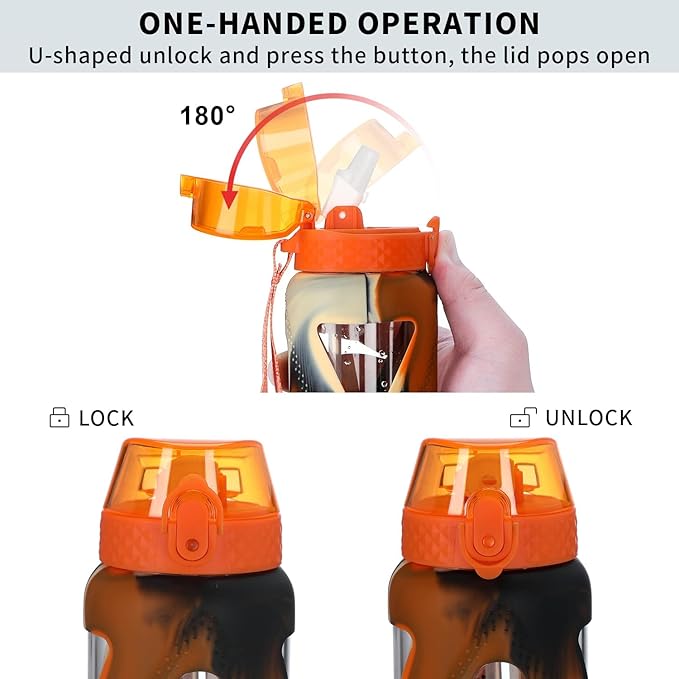 GOPPUS Glass Water Bottles with Straw and Flip Lid, Motivational Water Bottles with Time Marker Reminder and Silicone Sleeve, Leakproof, BPA Free (32 oz, Leopard Orange)