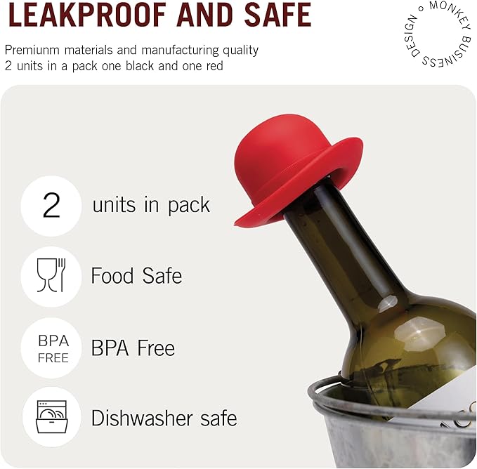 Monkey Business Silicone Wine Stopper | Seals Bottle and Keeps Wine Fresh/Cute Wine Accessories/Kitchen Gadgets/Bowler Hat Bottle Stopper (Set of 2)