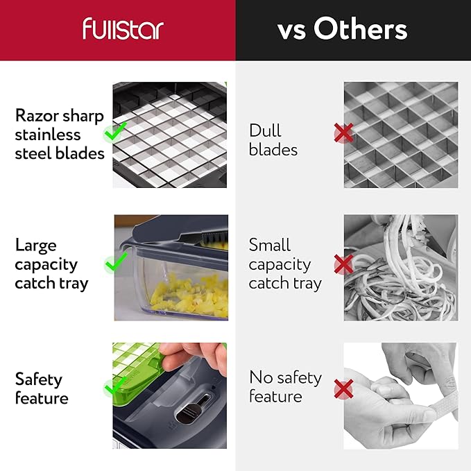 - The Viral Fullstar Vegetable Chopper - The Original Fullstar Veggie Chopper now comes with 2 interchangeable dicer blades! The built-in chop lid lets you cut foods directly into the 1.2L collection tray without the mess of a knife and cutting board. The storage container lets you hold prepared vegetables until you are ready to begin cooking.