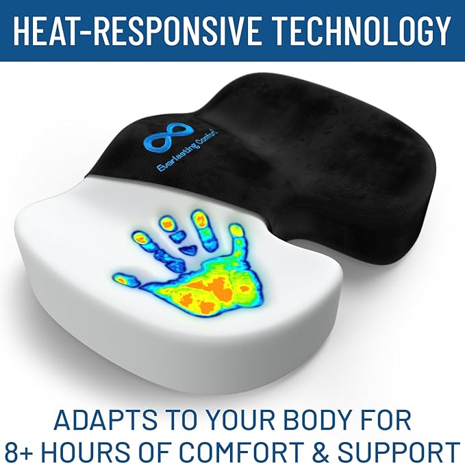 - ALL DAY SUPPORT: Enjoy lasting comfort during 8+ hr workdays with our seat cushion for desk chair. Made with premium memory foam, the computer chair cushion contours to your bottom using body heat while never flattening