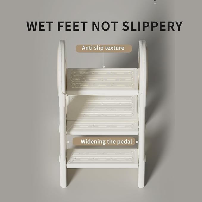 - 【STABLE AND NON-SLIP】Our toddler step stool features a sturdy A-shaped structure. The cushioned bottom is equipped with non-slip particles, while the surface of the step stool has a non-slip pattern. The mesh structure underneath provides optimal stability. The rounded handrail ensures your child can safely climb up and down. Rest assured, your children will have enough security.