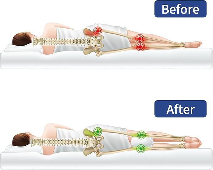 - 【Great for side or back sleepers】It has helped your back stay aligned and knees elevated as well as to not get sore without one.This will separate your legs and let your foot rest on top to keep them from getting tangled up. This pillow is also the right thickness; not too thick that it gets in the way, but just thick enough that it provides enough cushioning and separates the knees when lying on your side.