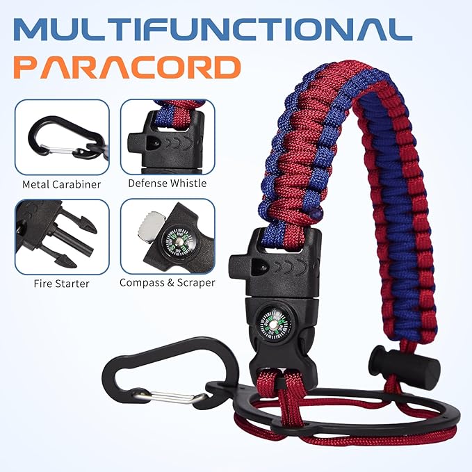 - PROTECTIVE BOOT & SURVIVAL PARACORD: Upgraded silicone boots prevent shattering and cracking when metal water bottle 128 oz accidental dropped. Humanized paracord handle for water bottles with compass, safety ring, carabiner, flint fire starter & whistle to be a perfect survival kit for adventure. Both design in individual styles to match the color of water canteen, stylish and practical in your daily use