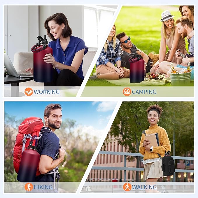 - SUPER VALUE COMBO: Buy 1 gallon water bottle 128 oz, get 9 accessories (2 x lids, 1 x survival paracord, 1 x carrying pouch, 1 x shoulder strap, 1 x silicone boot, 2 x straws, 1 x straw cleaner). With the most complete bottle accessories, these thermal water bottles are perfect for daily use at home, work, school, gym, road trips, hiking, camping or just hanging out
