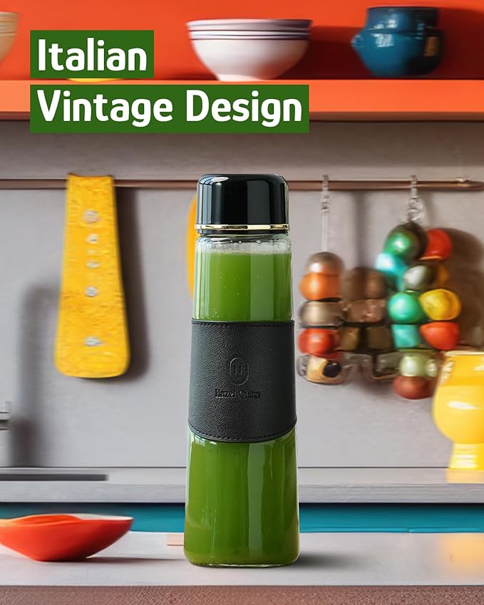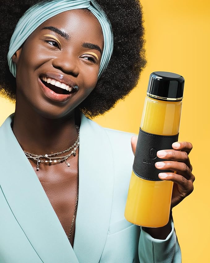Hazel Quinn Glass Water Bottles - 450 mL / 15 oz Borosilicate Glass Juice Bottle with Leather Cup Sleeve, Reusable BPA Free