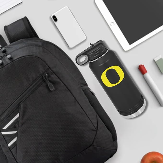 University of Oregon 32oz Stainless Steel Double Walled Black Beverage Bottle with Flip Straw Spout - College Gear for Playoff Season – For Office, Home or Auto – Show your Ducks Pride