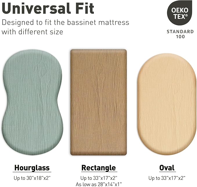 - PERFECT SIZE & EASY TO CLEAN: Our baby sheets are 33 x17 x4 inches, universal fit for all standard size oval, rectangle and hourglass bassinet mattress. Our bassinet sheets is easy to clean up and machine washable, light and breathable, and easy to dry, please wash before use.