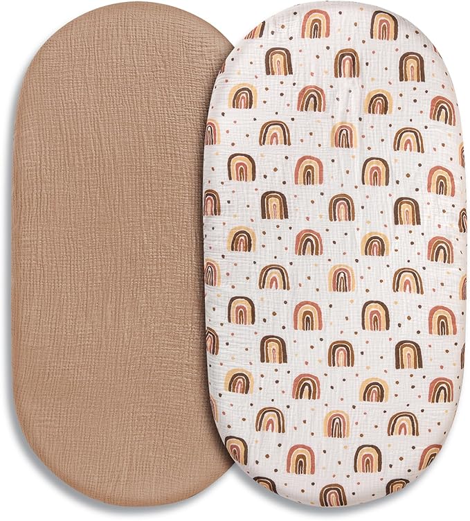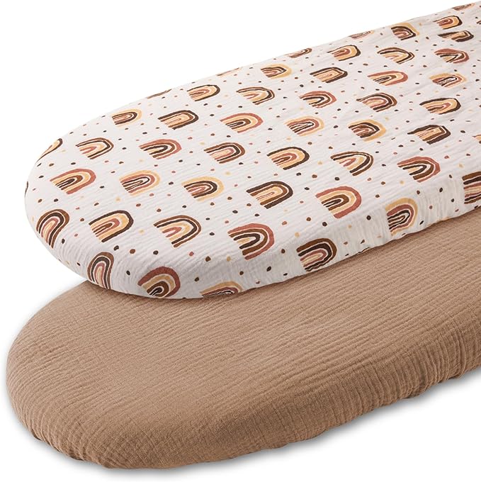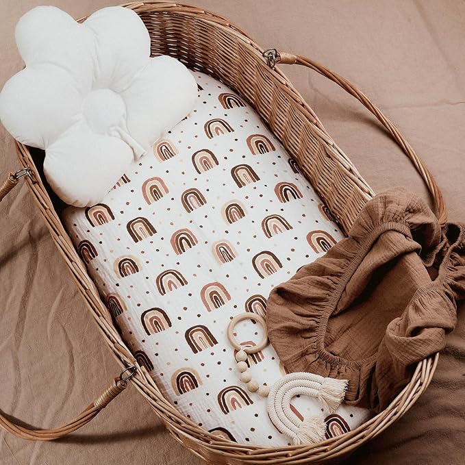 Muslin Bassinet Sheets 2 Pack for Baby Boy and Girl, Breathable Elastic Cozy Fitted Cotton Bassinet Mattress Sheet, Universal Fit for Hourglass Oval and Rectangle Bassinet Mattress (Cute Rainbow)
