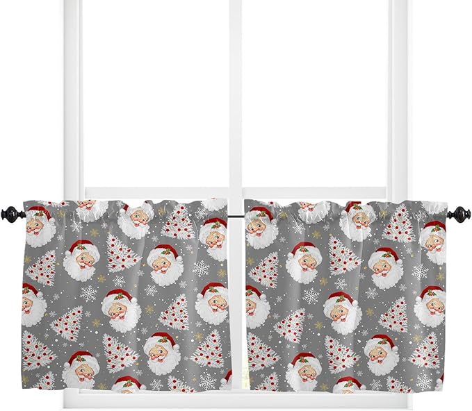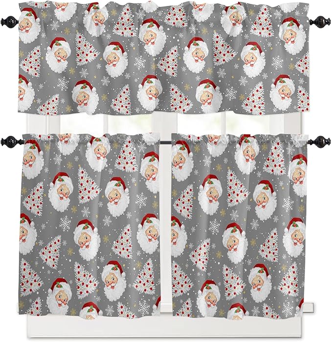Grey Christmas Kitchen Curtains and Valances Set, Santa Claus Merry Christmas Tree Windows Treatments Tiers Half/Short Curtains for Small Windows Cafe/Living Room/Bedroom 54x24 in Winter Snowflake