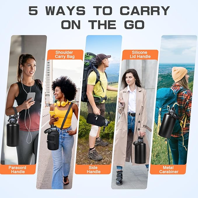 1 Gallon Water Bottle Insulated, Leak Proof 128 oz Stainless Steel Water Jug with Straw/Spout 2-in-1 Lid, Sleeve, Paracord Handle, Silicone Boot, One Gal Metal Canteen for Gym Sport Camping