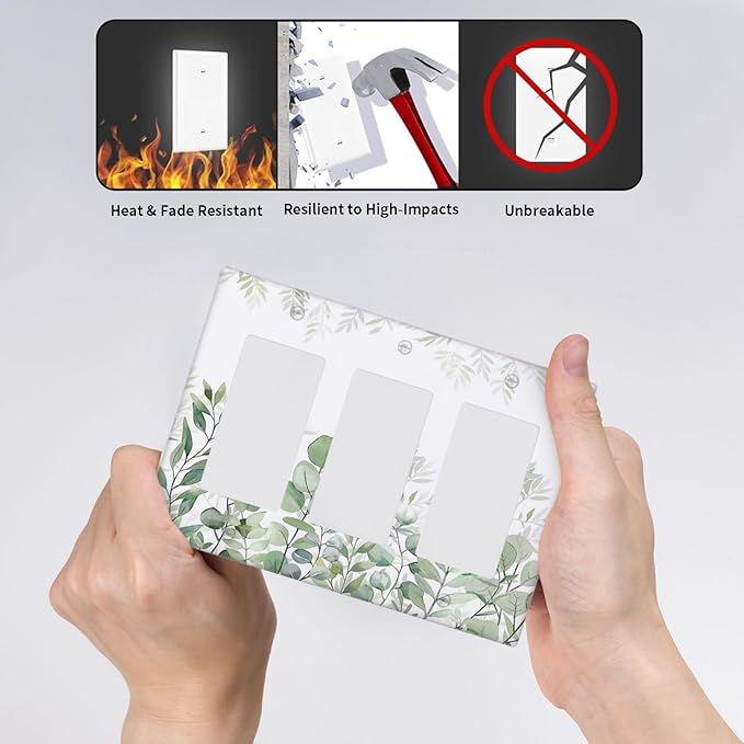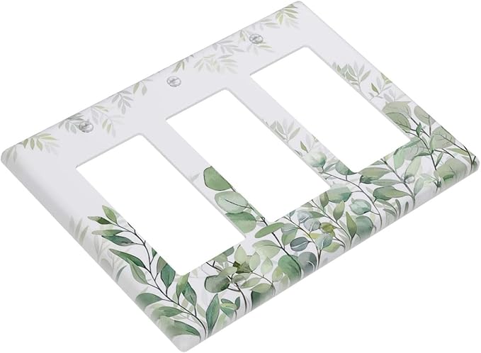 Green Eucalyptus Rustic Botanical Plant Leaves 3 Gang Rocker Boho Light Switch Covers Decorative Triple Outlet Wall Plate Cover Faceplate Decorative Switchplate GFCI for Country Bedroom Decor