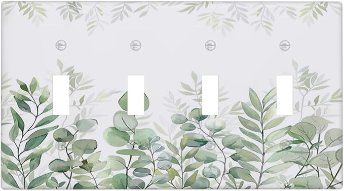 Green Eucalyptus Rustic Botanical Plant Leaves Quad Toggle Boho Light Switch Covers Decorative 4 Gang Wall Plate Electrical Faceplate Switchplate for Country Bedroom Bathroom Decor